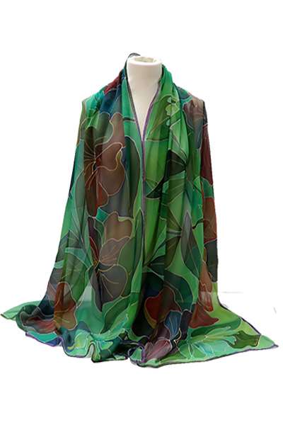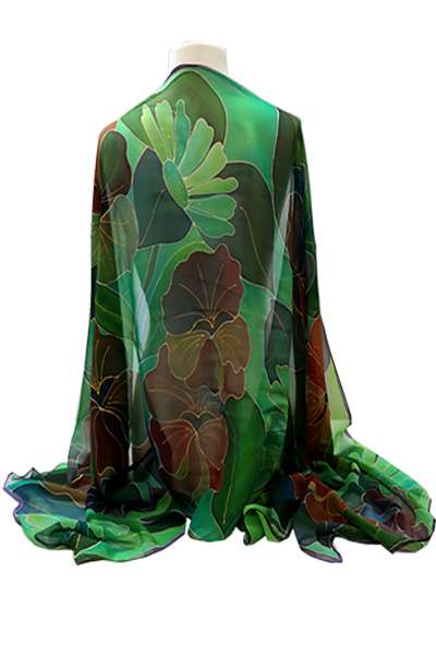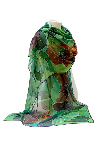 Chal de seda pintado a mano con dibujos de pensamientos y margaritas, en distintas tonalidades de verdes y granates, utilizando tintes naturales fijados al vapor, sobre seda natural 100% de gran calidad y orillados a mano.
